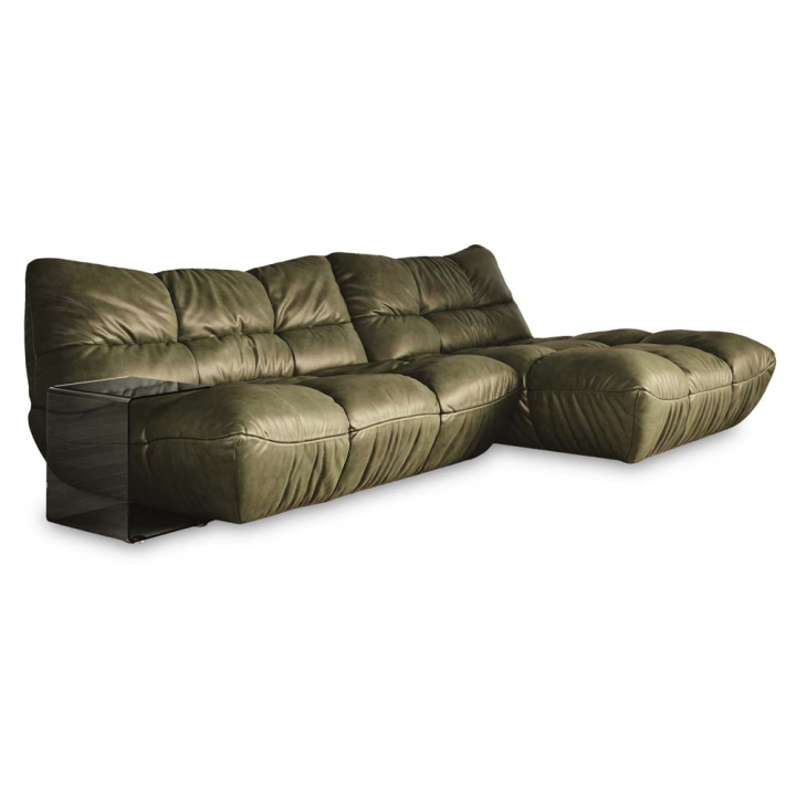 Ъгловата холна гарнитура Пейшън е създадена като лично пространство за релакс, където дизайнът и функционалността се движат в пълен синхрон. Зелената естествена кожа внася усещане за спокойствие и връзка с природата, докато меките, обемни форми приканват към дълги моменти на отдих. Моделът впечатлява със своята адаптивност - ръчното регулиране на облегалката и дълбочината на седене позволява гарнитурата да се нагоди към всяка поза и настроение. Универсалната конфигурация и изцяло тапицираният гръб превръщат Пейшън в гъвкаво и естетично решение за модерни, отворени пространства, където комфортът е водещ.
