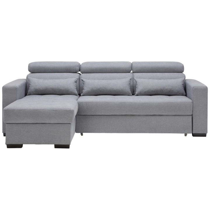 Класическа Г-образна холна гарнитура с регулируеми подглавници с размери на модела 240/179/83-98 см. Предлага завиден комфорт и удобство, като разполага с редица предимства. Дамаската е произведена от тъкан текстил, 100%, полиестер в сив цвят. Структурата на седалката е от пяна и зиг-заг пружини, допринасящи за големия комфорт на холната гарнитура. Други предимства на артикула са обширната ракла под лежанката, регулируеми подгланивци, както и възможността за преобразуване от диван в легло с площ за сън с размери 135/200 см.