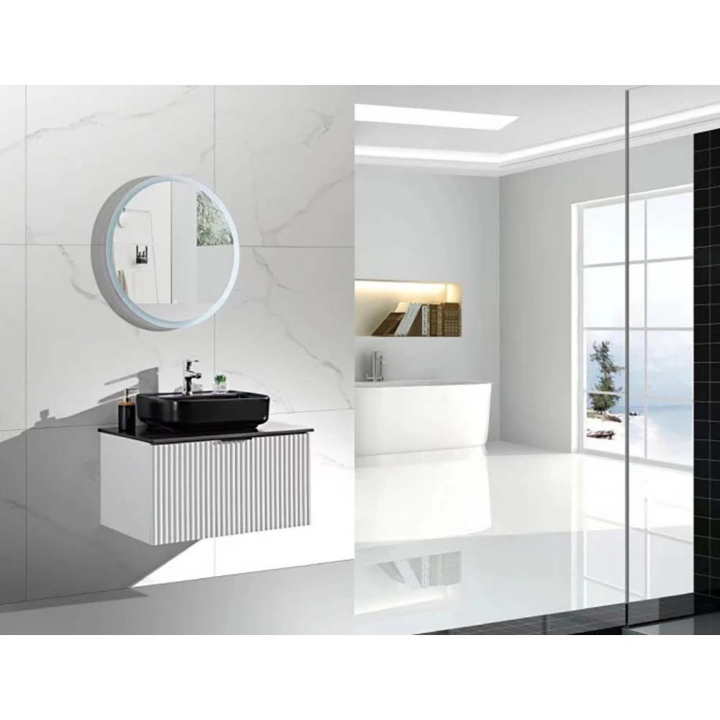 Модерната естетика среща практичността в този стилен комплект за баня. Чистите линии, елегантният фронт без дръжки и изтънчената комбинация от сив шкаф и чарен порцеланов умивалник превръщат банята в пространство на минимализъм и изящество. Кръглото огледало придава допълнителна дълбочина в пространството, създавайки усещане за простор.