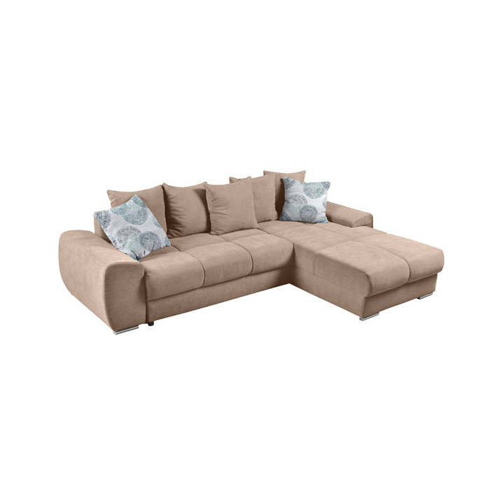 Комфортна, мека и функционална холна гарнитура за отдих и релакс с размери - Ш:271/Д:181/В:88 см. Със своите обемни възглавници за облягане създава приятна домашна атмосфера. Насладете се на дълги уютни нощи или мързеливи дни, сгушени на дивана. Идеално местенце за гледане на телевизия или четене на книга през свободното време. Притежава лежанка, ракла, както и възможност за обособяване в легло с площ за сън 205/138 см. Конструкцията е изработена от ПДЧ и масивна дървесина, стилно тапицирана с висококачествена дамаска в един цвят. Включени пет възглавници за облягане, както и две декоративни възглавници в акцентен цвят.