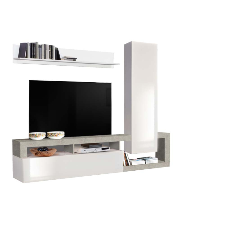 Модерна холна секция с размери Ш:219/Д:35/В:173 см. Със сигурност ще ви грабне със своята визия и стил. Моделът се състои от ТВ шкаф, полица за стенен монтаж, и един висок шкаф. Холната секция е произведена от ПДЧ, в бял гланц и сив цвят (бетон). Предоставя много място за съхранението на ТВ техника и апаратура, малки домашни предмети, лични вещи и аксесоари в хола.