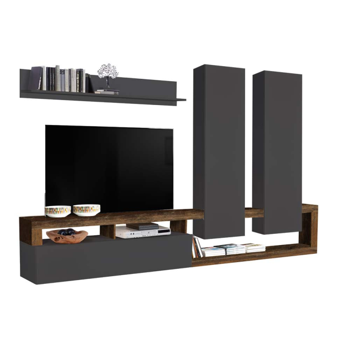 Елегантна холна секция, подходяща за вашето всекидневно помещение, притежаваща тъмна дървесна текстура, съчетана със сив цвят.