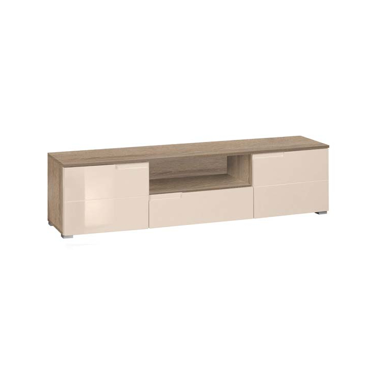 Модерна визия и удобство за вашия ТВ кът. Шкафът разполага функционално разпределение за съхранение и обширен плот, подходящ за повечето модели телевизори. Деликатната комбинация от светлия дървесен декор дъб Сонома и изящното бежово гланцово покритие внасят усещане за лекота и уют в интериора.
