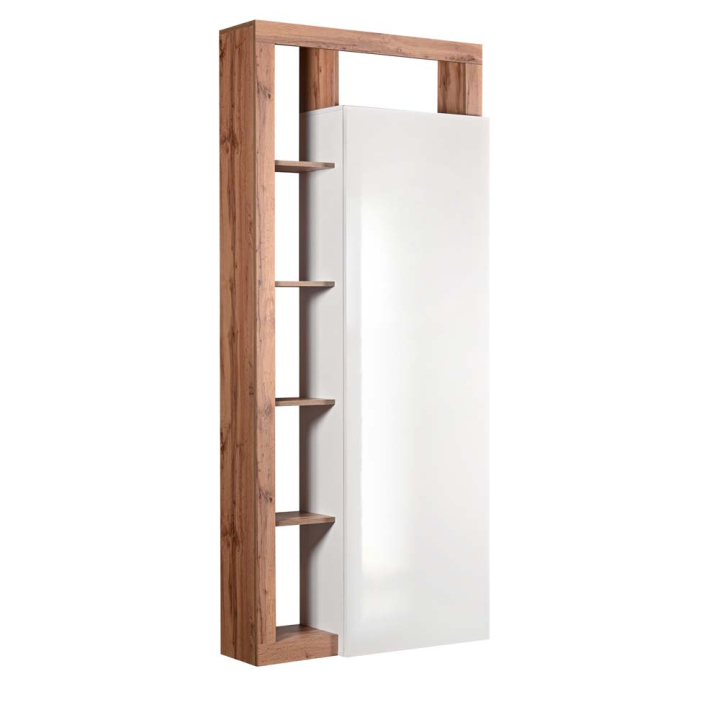 Модерен висок гардероб за антре с размери Ш:91/Д:30/В:209 см. Състои се от едно отделение с врата на панти, за които са монтирани два вътрешни рафта, един лост за закачалки, както и странично отделение (етажерка) с четири външни полици. На вътрешните рафтове ще намерят място малки домашни предмети, лични вещи и аксесоари, прилежно подредени и съхранени. Не само формата на гардероба е атрактивна. Цветовете на продукта са добре подбрани, визуално открояващи различните елементи на модела. Комбинацията от естествената дървесна текстура, репродукцията на светъл дъб с топъл оттенък с различни нюанси и бял гланц е изключително атрактивна и цялостно ще преобрази атмосферата в помещението, като добави домашен уют и лукс.