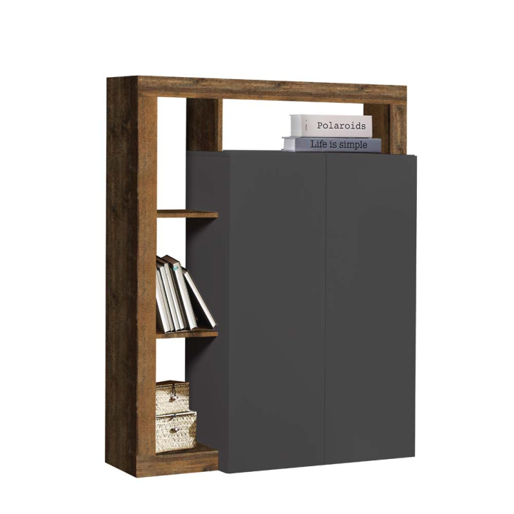 Вътрешното разпределение притежава, 2 врати, зад които ще откриете 4 рафта и място предназначено за минимум 20 чифта обувки. Външната структура предлага 2 странични рафта, на които може да подредите интересни елементи с ефектен акцент. Гардеробът е произведен от висококачествено ПДЧ - 16мм.