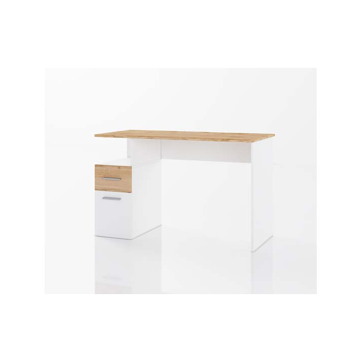 Компактно бюро за детска стая с размери Ш:120/Д:64/В:75 см. Впечатлява с модерен дизайн подходящ за обзавеждане на детска стая. Дизайнерите умело са комбинирали белия цвят и светлия дървесен декор. Състои се от плот с дървесна текстура, под който е обособена отворена ниша, едно чекмедже и едно отделение с врата на панти.