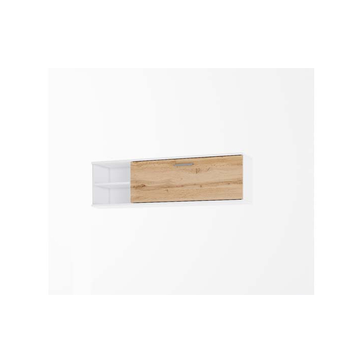 Стенна етажерка с размери Ш:120/Д:30/В:35 см. Състои се от правоъгълна конструкция с обособен един рафт и отделение с врата на панти с вертикално отваряне. Впечатлява с модерен дизайн подходящ за обзавеждане на детска стая. Дизайнерите умело са комбинирали белия цвят и светлия дървесен декор. Може да комбинирате модела с останалите мебели от серията, като легло с табла, гардероб, както и бюро със същата дизайнерска линия.