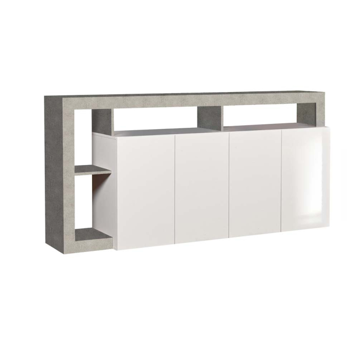 Модерен комод с размери Ш:184/Д:42/В:93 см. Притежава плот стилно декориран в сив цвят, две отделения с врати на панти, както и външно отделение, (етажерка) с една полица, практично слята с рафт над плота, под които са обособени две ниши. Зад четирите врати на панти са монтирани два рафта, където място ще намерят малки домашни предмети, лични вещи и аксесоари. Не само формата на комода е атрактивна. Цветовете на продукта са добре подбрани, визуално открояващи различните елементи на модела. Комбинацията от сив цвят и бял гланц е изключително атрактивна и цялостно ще преобрази атмосферата в помещението.