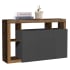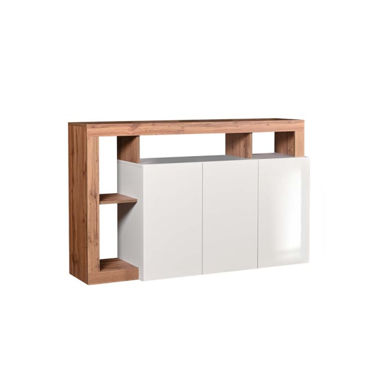 Модерен комод с размери Ш:146/Д:42/В:93 см. Притежава плот стилно декориран в тъмен дървесен декор, две отделения с три врати на панти, както и външно отделение, (етажерка) с една полица, практично слято с рафт над плота, под които са обособени две ниши. Зад трите врати на панти са монтирани два рафта, където място ще намерят малки домашни предмети, лични вещи и аксесоари. Не само формата на комода е атрактивна. Цветовете на продукта са добре подбрани, визуално открояващи различните елементи на модела. Комбинацията от естествената дървесна текстура, репродукцията на светъл дъб с топъл оттенък с различни нюанси и бял гланц е изключително атрактивна и цялостно ще преобрази атмосферата в помещението, като добави домашен уют и лукс.