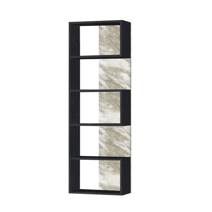 Дизайнерска висока пет редова етажерка с размери Ш:50/Д:25/В:175 см. Моделът притежава дизайнерски акцент, както по отношение на цветовете, така и по отношение на конструкцията. Конструкцията е здрава и стабилна произведена от ПДЧ. Рафтовете са декорирани в черен цвят, като единствено гърбът е с текстура от бял мрамор. На етажерката удобно може да съхранявате всякакви предмети, като любимите ви книги, списания, класьори А4, статуетки или артефакти. За повече сигурност е задължително етажерката да бъде фиксирана към стената. Продуктът е подходящ за функционалното обособяване на декоративни кътове в помещението.