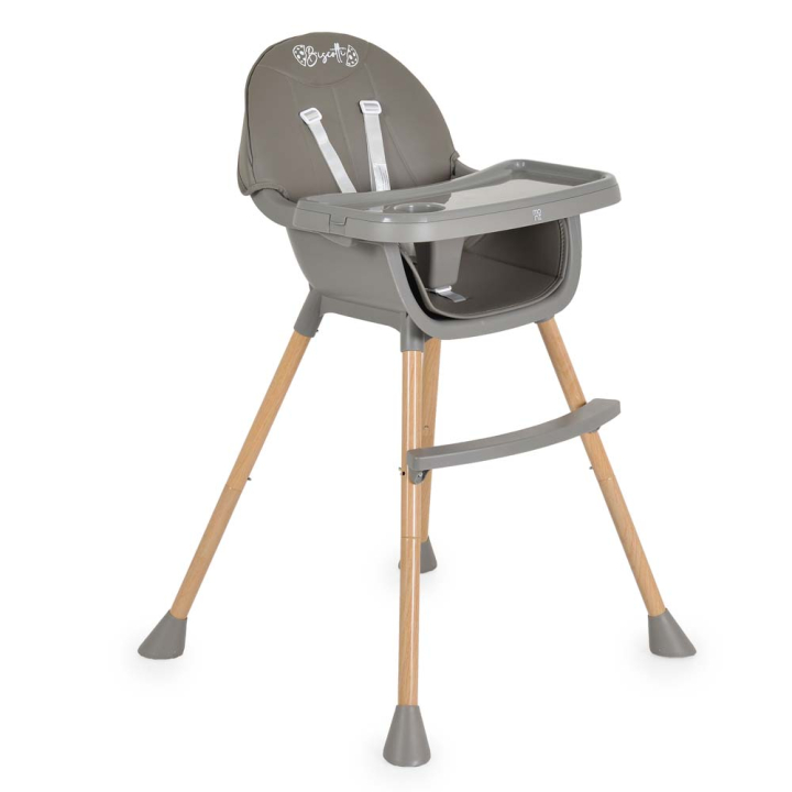 Столът за хранене Biscotti 2 в 1 расте заедно с детето. Той е стилен и функционален и е подходящ за деца над 6 месеца и до 15 кг, с възможност да се преобразува в нисък стол за по-големи деца над 2 години, до 20 кг. Разполага с двойна табла с поставка за чаша, която се регулира в две позиции и може да се сваля изцяло. Тапицерията от мека PU кожа се почиства лесно и е нежна към кожата на детето, а 5-точковият колан осигурява безопасност. Краката са със стабилни противоплъзгащи тапи и дървесен дизайн.