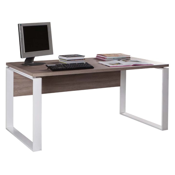 Офис бюро с размери Ш:140/Д:80/В:75 см. Моделът притежава специфичен дизайн, характерен за обзавеждане на офис помещения. Притежава семпла но модерна визия, бюро състоящо се от ПДЧ плот с меламиново покритие с големина 140/80 см, поставен на два правоъгълни метални крака в бял цвят. Притежава и фронтален вертикален плот с ширина 40 см, който прави бюрото подходящо за приемането и обслужване на клиенти. Плотът на бюрото е в тъмен дървесен декор (дъб трюфел) с красива дървесна репродукция без чворове. Бюрото е модерно и просторно с характерен дизайн, перфектното обзавеждане за офиси и професионални студия, като има достатъчно пространство за поставянето на монитор и клавиатура или лаптоп.