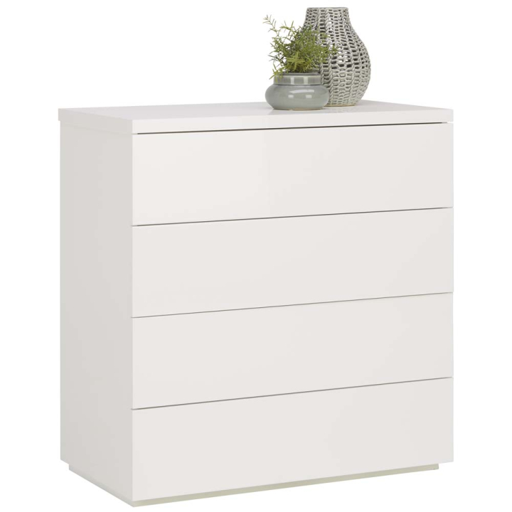 Модерен комод с чекмеджета с размери Ш:85/Д:44/В:88 см. Със своите четири чекмеджета, комодът е добро решение за обзавеждане на детска стая, но прекрасно би стоял и в дневната или хола. В обширните чекмеджета удобно и надеждно може да съхранявате дрехи, завивки, одеяла или детски играчки. Със своя бял цвят, комода без проблем може да се комбинира с мебели в други декори. Върху белия гланцов плот, може да поставите снимки, артефакти и други лични вещи, които цялостно ще променят атмосферата в помещението.