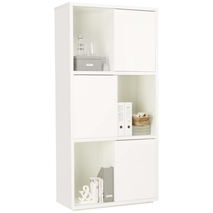 Модерна етажерка с размери Ш:90.3/Д:40/В:187.6 см. Със своите три рафта, етажерката е добро решение за обзавеждане на детска стая, но прекрасно би стоял и в дневната или хола. В обширните ниши удобно и надеждно може да съхранявате книги, папки, артефакти или детски играчки. Всеки рафт разполага с плъзгаща врата, която може да обособи зона за презентации или дискретна ниша за съхранение. Със своя бял цвят, етажерката без проблем може да се комбинира с мебели в други декори. Върху горния плот, може да поставите, кутии за съхранение на предмети или други лични вещи.
