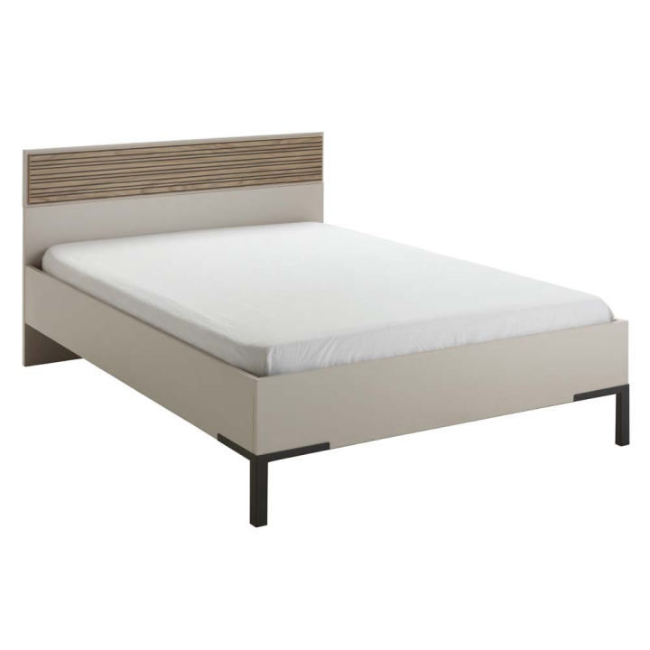 Леглото Браво съчетава уют, стил и функционалност, превръщайки стаята в място за пълноценна почивка и спокойствие. Кашмирената основа и таблата в дъбов декор с релефна структура създават топла атмосфера, а черните метални крака добавят завършват визията.