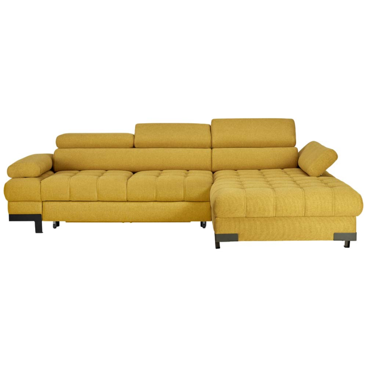 Ъглова пет местна холна гарнитура с размери Ш:270/Д:173/В:75 см. Артикулът съчетава модерна визия и удобствата на съвременната мебелна индустрия, по отношение на практичност и функционалност. Облегалката и седалката са с пълнеж от висококачествена пяна и зиг-заг пружини, а тапицерията е произведена от тъкан плат 100% полиестер. Акцент в модела са многостепенно регулиращите се подглавници и подлакътници, допринасящи за незаменимия комфорт по време на седене. Меката мебел притежава просторна ракла, обширна лежанка, както и възможност за бързо трансформиране в легло с площ за сън 216/122 см. Капитонираната седалка с елегантни декоративни шевове, се вписват по уникален начин в цялостната визия на холната гарнитура, а атрактивната дамаска в жълт цвят (куркумено жълто) добавя много положителна енергия към помещението. Безспорните качества на тъкания текстил гарантират дълготрайната и безпроблемна употреба на меката мебел. Може да забележите дизайнерският подход във всеки един детайл на артикула, както по отношение на капитонираната седалка с двоен декоративен шев, металните 10 см крачета, така и на овалните форми на възглавниците за сядане и облягане, които са здраво фиксирани към конструкцията.