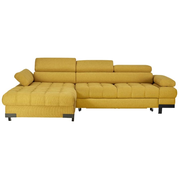 Ъглова пет местна холна гарнитура с размери Ш:270/Д:173/В:75 см. Артикулът съчетава модерна визия и удобствата на съвременната мебелна индустрия, по отношение на практичност и функционалност. Облегалката и седалката са с пълнеж от висококачествена пяна и зиг-заг пружини, а тапицерията е произведена от тъкан плат 100% полиестер. Акцент в модела са многостепенно регулиращите се подглавници и подлакътници, допринасящи за незаменимия комфорт по време на седене. Меката мебел притежава просторна ракла, обширна лежанка, както и възможност за бързо трансформиране в легло с площ за сън 216/122 см. Капитонираната седалка с елегантни декоративни шевове, се вписват по уникален начин в цялостната визия на холната гарнитура, а атрактивната дамаска в жълт цвят (куркума) добавя много положителна енергия към помещението. Безспорните качества на тъкания текстил гарантират дълготрайната и безпроблемна употреба на меката мебел. Може да забележите дизайнерският подход във всеки един детайл на артикула, както по отношение на капитонираната седалка с двоен декоративен шев, металните 10 см крачета, така и на овалните форми на възглавниците за сядане и облягане, които са здраво фиксирани към конструкцията.