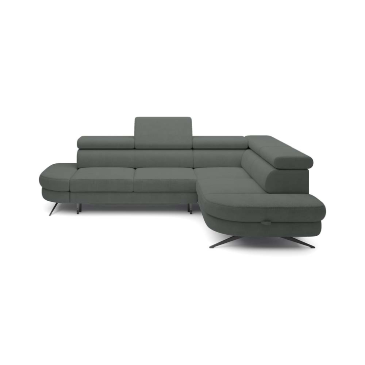 Практичната отоманка вдясно включва ракла за съхранение, а 5-те подвижни подглавници добавят персонализиран комфорт. Металните черни крака с височина 14 см придават изискано излъчване, а текстилната дамаска в маслено зелен цвят гарантира топлина и елегантност във всеки дом.