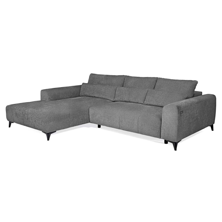 Сива ъглова холна гарнитура Диего с лява лежанка, електрическа функция за регулиране на дълбочината на седалката и включени 3 лумбални възглавници, размери: 279/222/134 см
