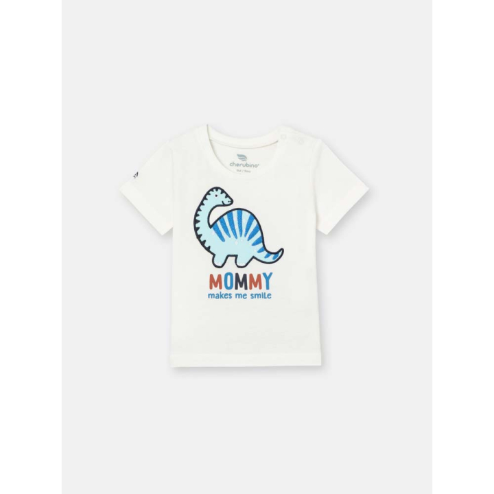 Светлобежова памучна тениска с къс ръкав и забавен принт, 56-80 см