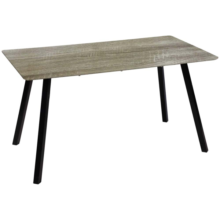 Трапезна маса с елегантни метални крака с размери Ш:140/Д:80/В:76 см. Плотът на модела е произведен от MDF с гладко покритие стилно декориран в светъл дървесен декор (Сан Ремо), поставен на четири фино боядисани метални крака. Моделът трапезната маса е елегантно допълнени към трапезарията или дневната, като със своите размери може да настани удобно от 4 до 6 човека.