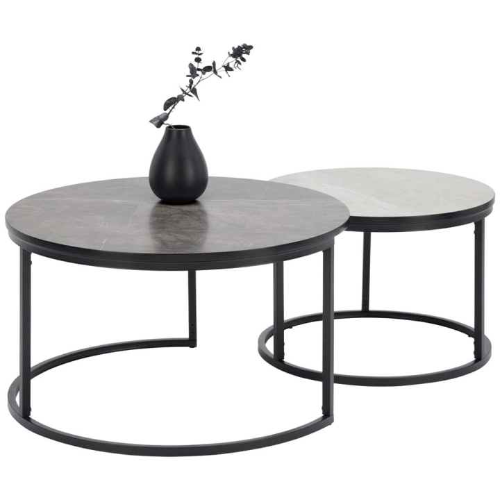 Комплект от 2 холни маси с размери Ш:60/Д:60/В:42 см и Ш:80/Д:80/В:45 см. Масите са с еднотипен дизайн, като единствено едната е по-малка. Много функционално по-малката маса от комплекта може да се постави под по-голямата, и по този начин да пестите място в помещението. Всяка маса е произведена от метални обръчи. В най-горният е поставен кръгъл плот от MDF с мраморна текстура с максимална товароносимост до 30 кг. По-голямата маса е с плот в черна мраморна текстура с бели ивици. По-малката маса е в бял мрамор с черен кант по периферията.