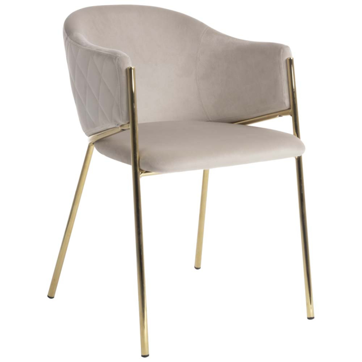 Елегантен трапезен стол с размери Ш:60/Д:54/В:79 см. Моделът притежава изключителен дизайн, като същевременно предоставя завиден комфорт по време на седене. Кадифената дамаската е произведена от тъкан текстил, 100% полиестер, изключително приятна на допир, с пълнеж от висококачествена пяна за безкомпромисен комфорт. Тапицерията на облегалка е моделирана на ромбове посредством декоративни шевове допълващи дизайна и създаващи приятна домашна атмосфера. Седалката е поставена на златиста стоманена рамка с протектори щадящи пода с максимална товароносимост до 140 кг. Столът е с модерен дизайн с подчертан висок стандарт на живот. Моделът ще ви предостави така нужния комфорт по време на приятните закуски, обеди и вечери с любими хора и приятели.