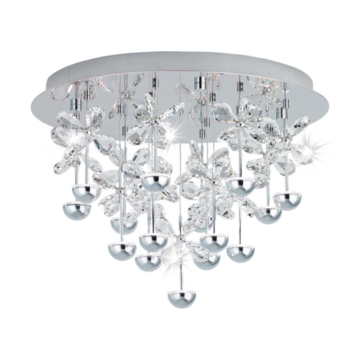 Тази лампа с атрактивна визия ще ви спечели и ще очарова вкуса ви към романтичното осветление. 15 кристални цветчета са захванати върху фини шнурове, които се спускат от тавана и оформят 3D композиция във въздуха.