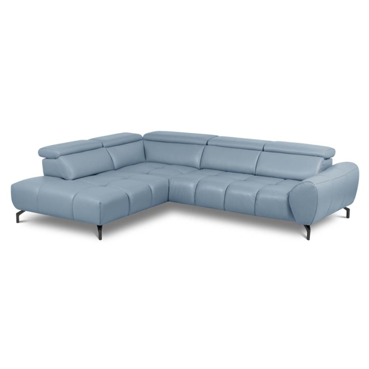 Синя ъглова холна гарнитура Аеро от естествена кожа с лява лежанка, релакс функция на седалките и облегалките и регулируеми подглавници, размери: 294/224/72-92 см