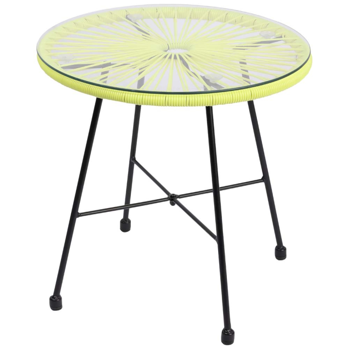 Тя е кокетна, с размер Ф50/53, стабилна метална конструкция, красив плот от вплетени светлозелени PVC въжета, покрити със здрава стъклена основа. Използвайте я като помощна, като основна или просто като дизайнерски трик навсякъде, където ви хрумне - тя е лека (5,700 кг) и подходяща за цветните ви летни моменти.