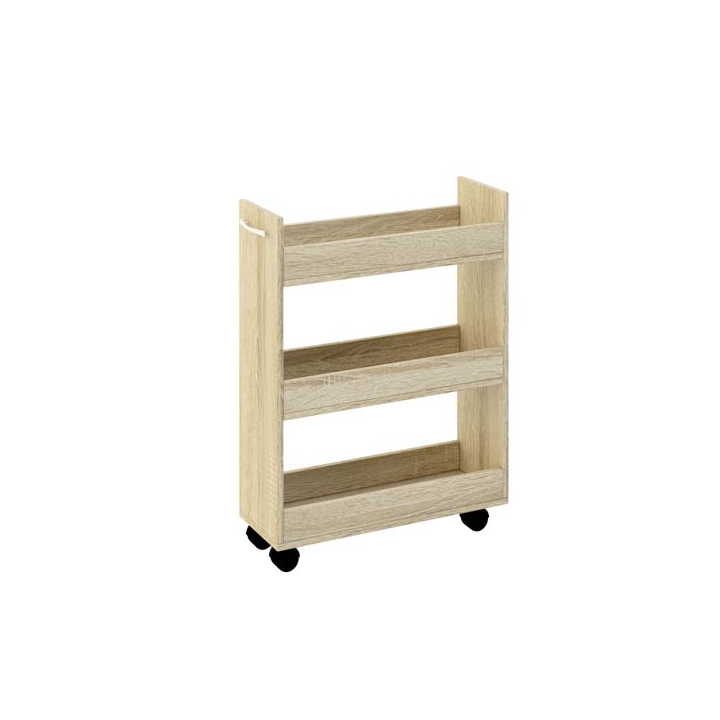 Сервизна количка с размери Ш:60/Д:22/В:79 см. Направете ежедневието ви по-лесно и приятно с тази сервизна количка. Предлага удобство, продължителна употреба и безопасност на продуктите поставени на нея. Притежава конструкция произведена от ПДЧ в дървесна текстура (дъб Сонома), поставена на четири колелца, въртящи се около оста си, за бързо и лесно позициониране. Притежава три рафта за поставянето на хранителни продукти, напитки и прибори, като със своята компакта форма, може да бъде поставена почти навсякъде в помещението.
