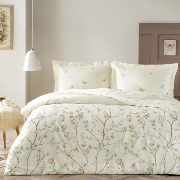 Комплектът в бежово осигурява приветливост и пролетно настроение, благодарение на флоралните елементи с пеперуди. При внимателно третиране и следване на инструкциите за поддръжка, текстилът ще съхрани дълготрайно високите качества, наситените цветове и плътността, с която се отличава.