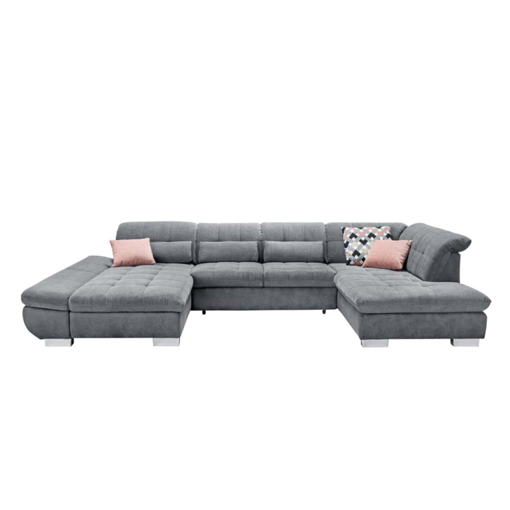 Модерна П-образна холна гарнитура с размери Д:211/Ш:350/Д:204/В:80 см. Предоставя много удобство и комфорт за семейството и приятелите. Със своята функционалност и модерна визия ще направи ежедневието ви по-приятно. Дългите часове пред телевизора ще минават неусетно в удобна и комфортна атмосфера. Облегалката и седалката са произведени от висококачествена полиетерна пяна с еластични гъвкави пружини (nosag), допринасящи за големия комфорт по време на седене. Тази технология на изработка прави меката мебел изключително удобна и комфортна. Освен че, предоставя много удобство, този метод на изработка гарантира дълготрайната употреба на холната гарнитура. Със своята П-образна форма меката мебел предоставя съществени удобства, като раклa за съхранение на одеяла и завивки, лесно и бързо трансформиране от диван на спалня, както подвижен подглавник със степенно регулиране. Корпусът на меката мебел е стилно тапицирана и поставена на сребристи крачета с правоъгълна форма. Дамаската на гарнитурата е приятна на допир и усещане, което от своя страна прави престоя още по-уютен. Като допълнение, за повече удобство към холната гарнитура получавате шест декоративни възглавници. По отношение на комфорт и функционалност тази холна гарнитура е безспорен фаворит.
