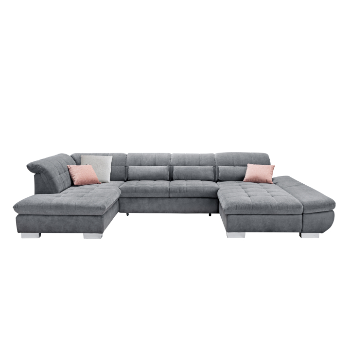 Модерна П-образна холна гарнитура с размери Д:211/Ш:350/Д:204/В:80 см. Предоставя много удобство и комфорт за семейството и приятелите. Със своята функционалност и модерна визия ще направи ежедневието ви по-приятно. Дългите часове пред телевизора ще минават неусетно в удобна и комфортна атмосфера. Облегалката и седалката са произведени от висококачествена полиетерна пяна с еластични гъвкави пружини (nosag), допринасящи за големия комфорт по време на седене. Тази технология на изработка прави меката мебел изключително удобна и комфортна. Освен че, предоставя много удобство, този метод на изработка гарантира дълготрайната употреба на холната гарнитура. Със своята П-образна форма меката мебел предоставя съществени удобства, като раклa за съхранение на одеяла и завивки, лесно и бързо трансформиране от диван на спалня, както подвижен подглавник със степенно регулиране. Корпусът на меката мебел е стилно тапицирана и поставена на сребристи крачета с правоъгълна форма. Дамаската на гарнитурата е приятна на допир и усещане, което от своя страна прави престоя още по-уютен. Като допълнение, за повече удобство към холната гарнитура получавате шест декоративни възглавници. По отношение на комфорт и функционалност тази холна гарнитура е безспорен фаворит.