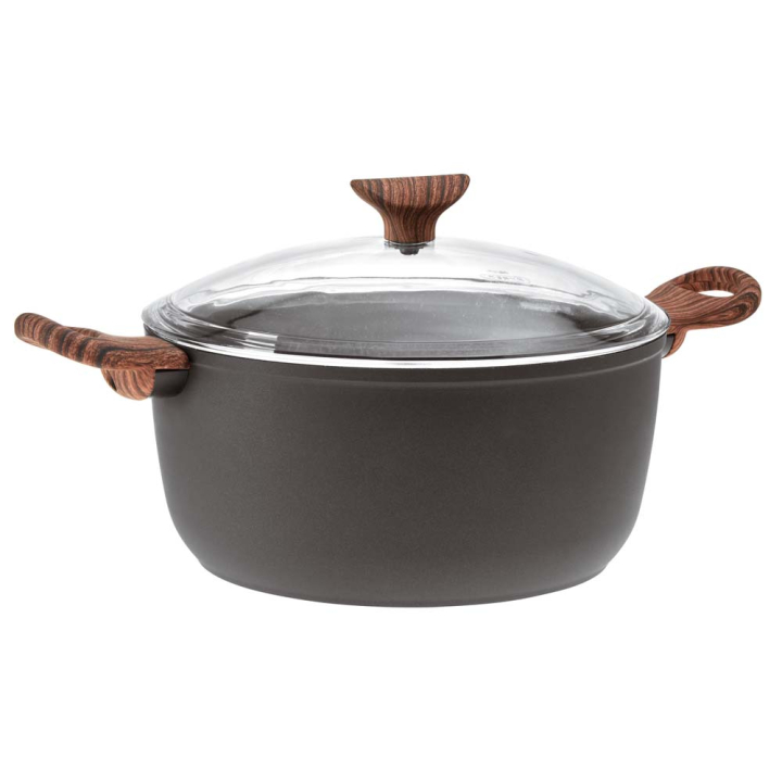 SAMB ROCK & ROSE черна алуминиева тенджера с дръжки имитация на дърво и стъклен капак, Ф24 см