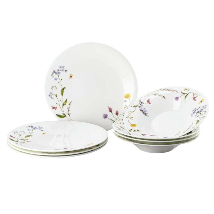 Уханни цветя и малки шарени пеперуди украсяват елегантния порцелан, изобразени с фино внимание към детайла. Порцеланът проблясва в синхрон с аранжировката и създава пролетна атмосфера с приказна поляна на масата.