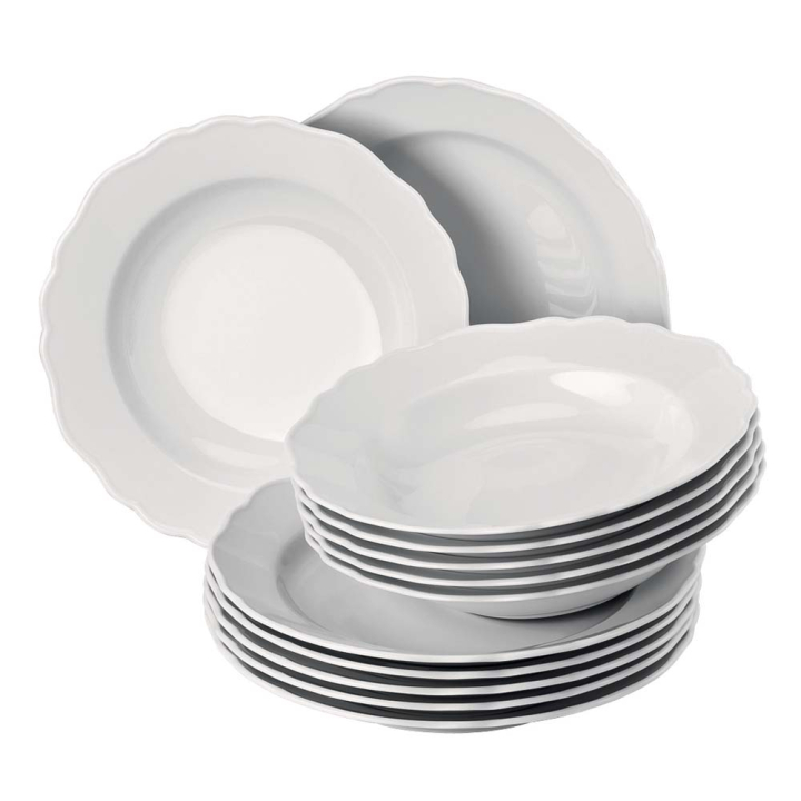Класическият бял цвят на комплекта носи семпъл дизайн на трапезата, а фино очертаните вълни по ръбовете разчупват визията с акцент. Вечната елегантност се усеща с лека винтидж нотка и съчетава старите традиции с модните тенденции в моментите на сервиране.