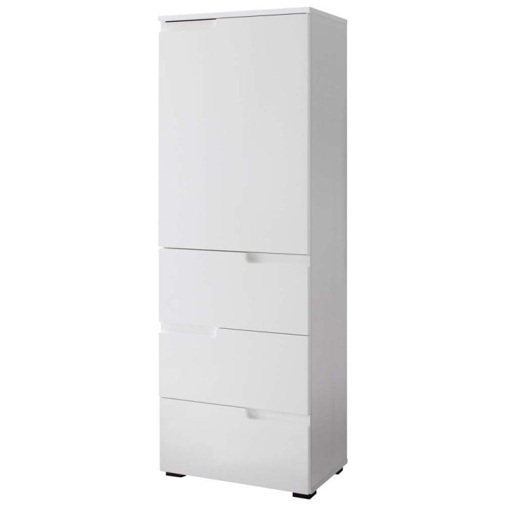 Съвременен шкаф с три чекмеджета с размери Ш:50/Д:35/В:145 см. Модерно и практично допълнение към дома или офиса. С този шкаф ще увеличите пространството за удобното съхранение на различни по предназначение предмети. Зад вратичката на панти са обособени две отделения, в които може да поставите дрехи, завивки, книги и всякакви други вещи от ежедневието. Трите дълбоки чекмеджета са идеални за съхранението на бельо, кърпи и всякакви други лични вещи. Корпусът на шкафа е произведен от ПДЧ с бяло матово покритие, а фронтовете на вратичките от MDF в луксозен бял гланц.