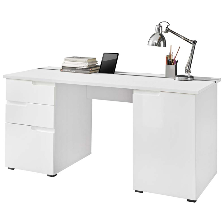 Съвременно бюро със семпъл, но елегантен дизайн с размери Ш:158/Д:67/В:76 см. Корпусът на бюрото е произведен от ПДЧ с бяло матово покритие, а фронтовете на шкафа и чекмеджетата под плота от MDF в бял гланц. Така моделирано, бюрото създава приятна и креативна работна атмосфера. Алуминиевият профил, вграден в предната част на плота, спомага за практичното полуизправено поставяне на таблета или телефона, като по този начин винаги ще бъдат удобни за наблюдение.