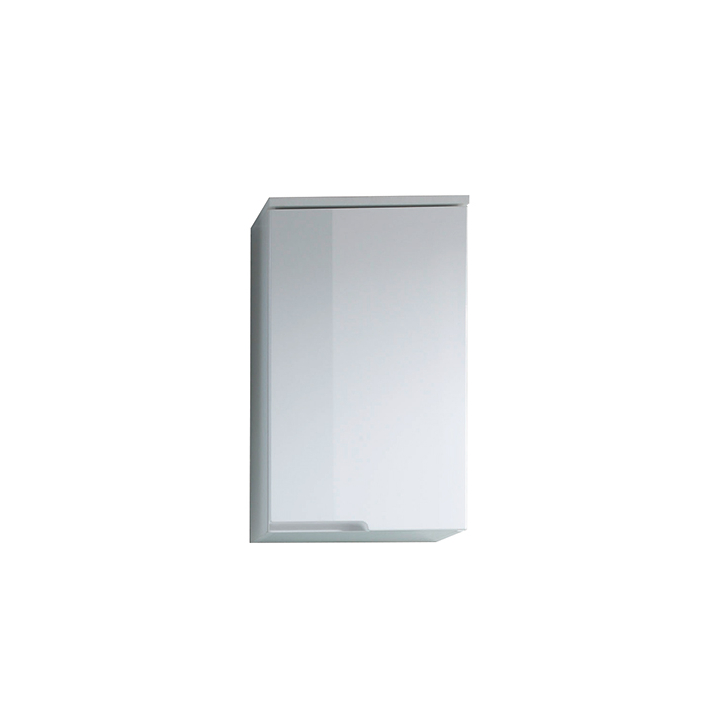 Горен шкаф за баня с бяло гланцово покритие с размери на продукта Ш:40/Д:23/В:67 см. Моделът е влагоустойчив, произведен от MDF и ПДЧ, предназначен за стенно окачване. Състои се от отделение с врата на панти с улей за дръжка, зад която е монтиран един рафт, удобно място за съхранение на лични вещи и аксесоари в банята.