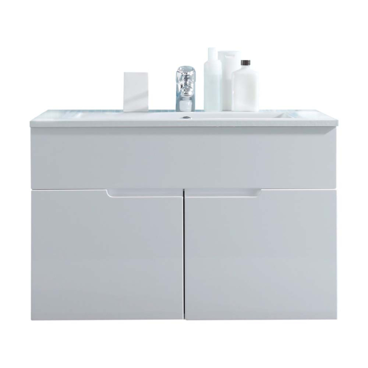 Долен влагоустойчив шкаф с бяло гланцово покритие в комплект с мивка с размери на продукта Ш:81/Д:47/В:55 см. Под мивката е обособено отделение с две врати на панти с улеи за дръжки. Мивката е с отвор за смесител и преливник произведена от полимермрамор устойчив на температурни разлики и препарати. Шкафът е предназначен за стенно окачване, което прави пространството под него лесно за почистване.