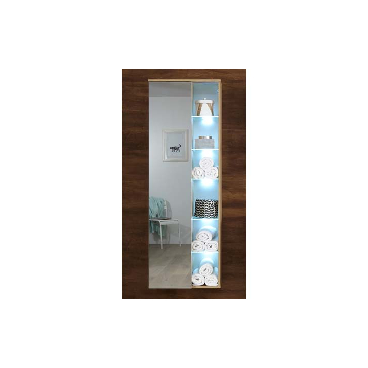 Висок шкаф колона за окачване без крака, с модерен дизайн и функционално разпределние. Шкафът е изработен от ПДЧ с меламиново покритие, в декор див дъб с дървесна структура.