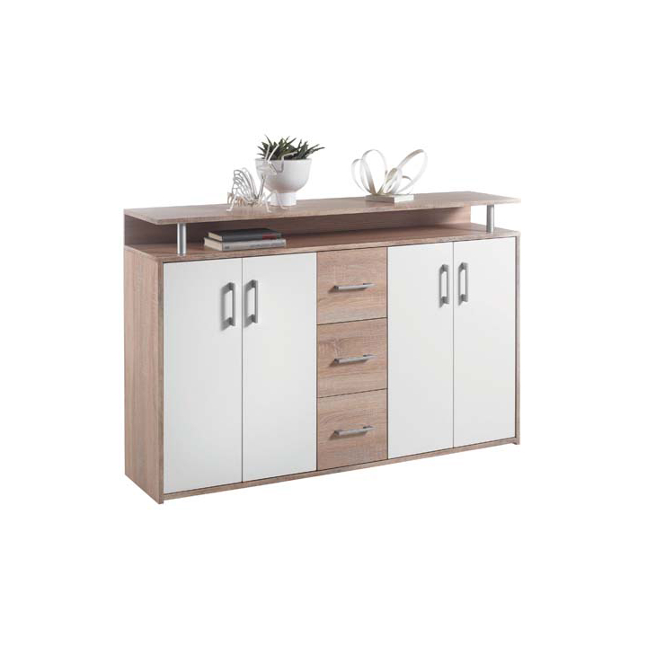 Комод с горен допълнителен плот и чекмеджета с размери Ш:139/Д:34/В:90 см. Моделът разполага с различни по вид и предназначение отделения за съхранение на лични вещи, аксесоари и предмети. Освен в дневната, практично място може да намери в офиса. Разполага с две отделения с четири врати на панти, три практични чекмеджета монтирани едно под друго, отворена ниша, както и достатъчно голям плот за поставянето на вещи, които искаме да са на видно място. В зависимост от вашите предпочитания и обзавеждането в помещението може да изберете комода да бъде с различни декори: бяло-сив или бяло и светъл дървесен. С този комод бързо и лесно ще организирате личното си пространство, като всичко ще лесно достъпно и надеждно съхранено.