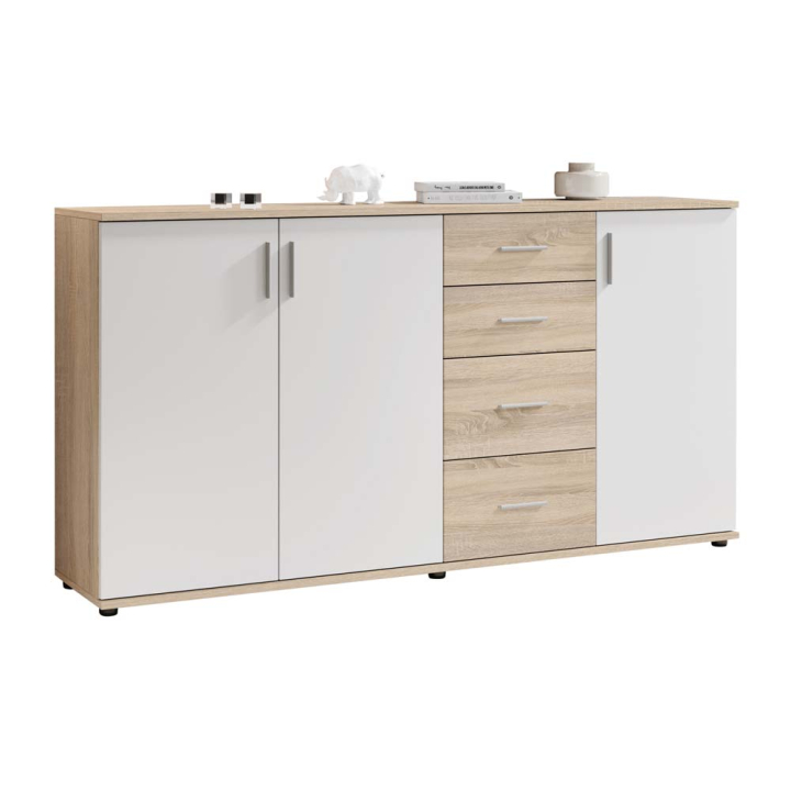 Модерен шкаф с две отделения и четири чекмеджета с размери Ш:160/Д:35/В:82 см. Комодът е стилно декориран в бяло и светъл дървесен декор. Притежава три врати на панти с монтирани дръжки в сребрист цвят. Моделът е практично и функционално обзавеждане, както за дома така и за офиса.