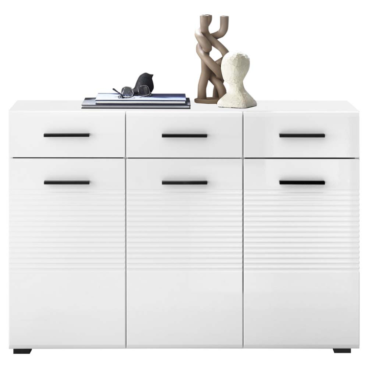 Комод с бяло гланцово покритие с размери Ш:120/Д:40/В:83 см. Моделът притежава стабилна конструкция изцяло декориран в бял цвят. Белият гланц, освен че изглежда страхотно, е лесен за поддържане и почистване и устойчив на механични наранявания. Под плота са монтирани три еднотипни чекмеджета, за малки домашни предмети, както под тях са обособени три еднотипни отделения с врати на панти, зад които са монтирани три рафта. Комодът е с класическа визия но декоративните улеи на вратите и белият гланц го правят атрактивен и уникален, като удачно би стоял в дневната, трапезарията или спалнята.