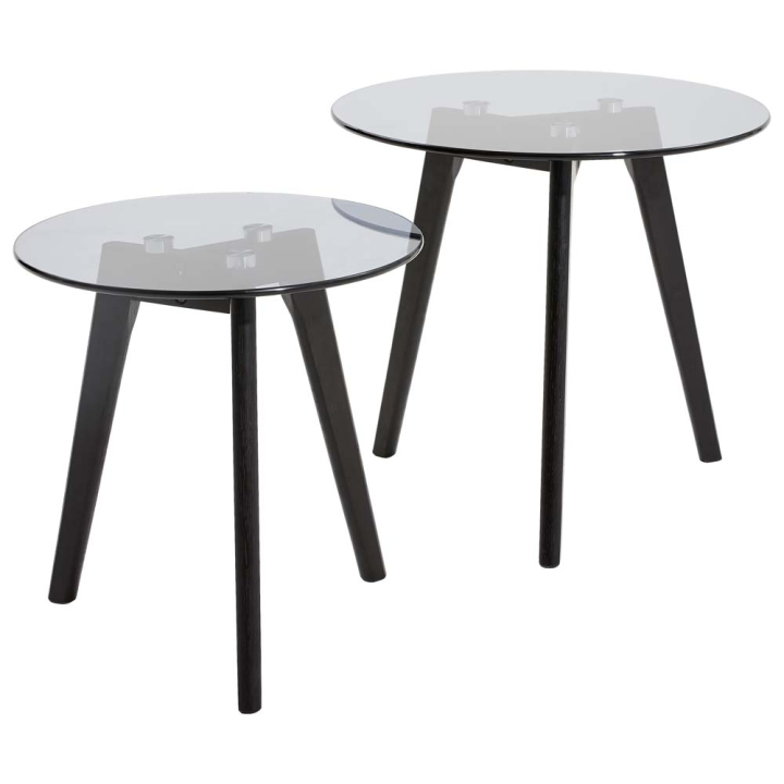 Комплект от две холни маси с кръгли стъклени плотове с размери Ш:50/Д:50/В:45 см, Ш:40/Д:40/В:40 см. Масите са еднотипни, като единствено едната е по-малка. Притежават сив стъклен плот поставен на дизайнерска конструкция с три крака в черен дървесен декор. Добро решение за обзавеждане на хола или дневната, като разположението на масите в помещението оставаме на вашето разположение.