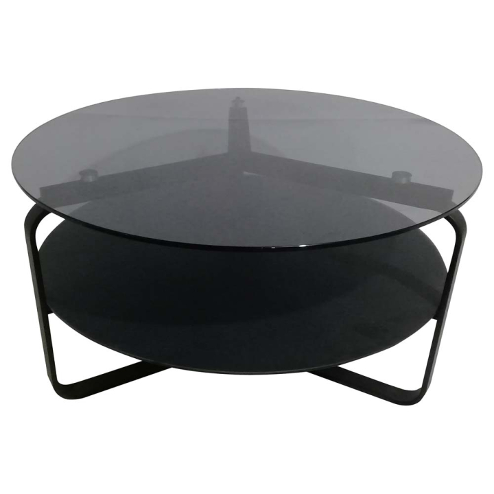 Кръгла холна маса със стъклен плот с размери на продукта Ш:80/Д:80/В:40 см. Комбинацията между метал и стъкло при изработката на модела е изключително атрактивна и актуална. Притежава модерен дизайн, като кръглия плот е произведен от опушено стъкло, поставен на красива метална рамка с протектори, щадящи пода. Под плота е монтиран рафт за удобното съхранение на малки предмети в хола.