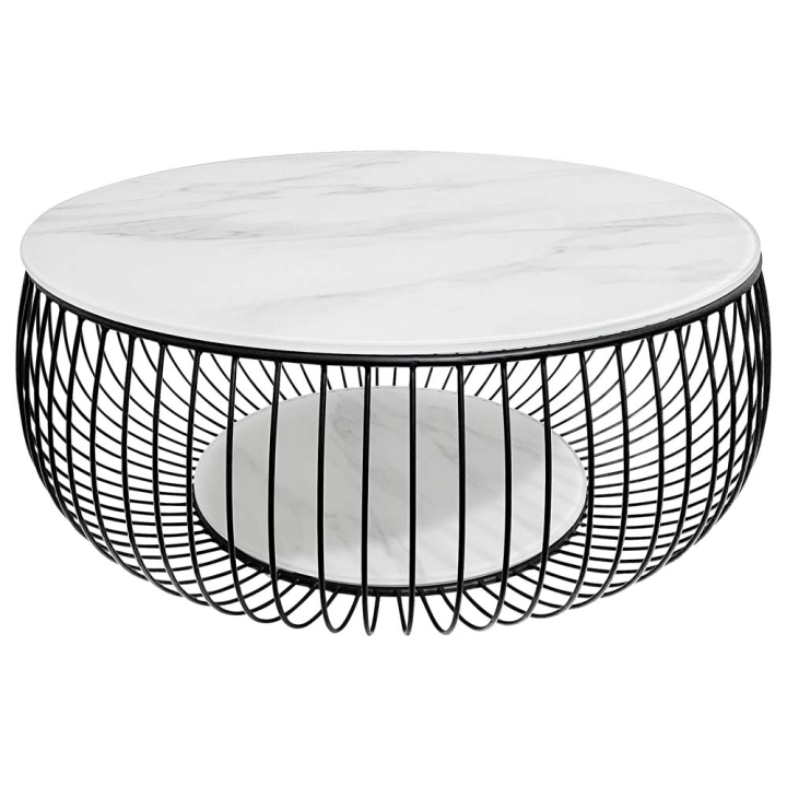 Цялостната концепция на масата е базирана на черна метална основа, индикатор за стабилност и плот, в мраморна текстура, изработена от пясъкоструйно мраморно стъкло и бял цвят.