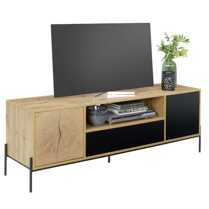 ТВ шкаф в индустриален стил с модерен акцент. Този модел комбинира топлият уют на дървесния декор с строгият характер на контрастното черно. Дизайнът е хармонично съчетание на рустик с индустриален стил – впечатляващ акцент за всяка съвременна дневна. Особено внимание привлича вратата, декорирана с имитация на дървесна сърцевина – автентично усещане, подсилено от 3D фолио, което трудно се различава от естествена дървесина.