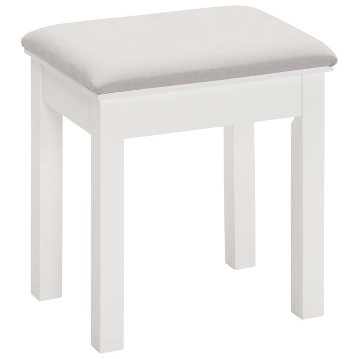 Класическа бяла табуретка с тапицирана седалка с размери Ш:40/Д:30/В:45 см. Изключително практично обзавеждане, с най-разнообразно предназначение. Може да бъде поставена пред тоалетката, до спалнята или в антрето, като табуретката лесно ще намери своето място в дома. За удобното поставяне на грим или комфортното обуване на обувките, винаги ще бъде незаменим помощник. Освен практична, табуретката ще внесе романтична нотка в спалнята със своята класическа визия и стил, като без проблем може да се комбинира и с други мебели в помещението. Моделът е здрав и стабилен, с крака произведени от дървесина с макс. товароносимост до 100 кг. Дамаската е от тъкан текстил, 100 % памук, устойчива на износване с пълнеж от пяна (дунапрен).